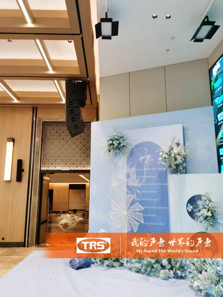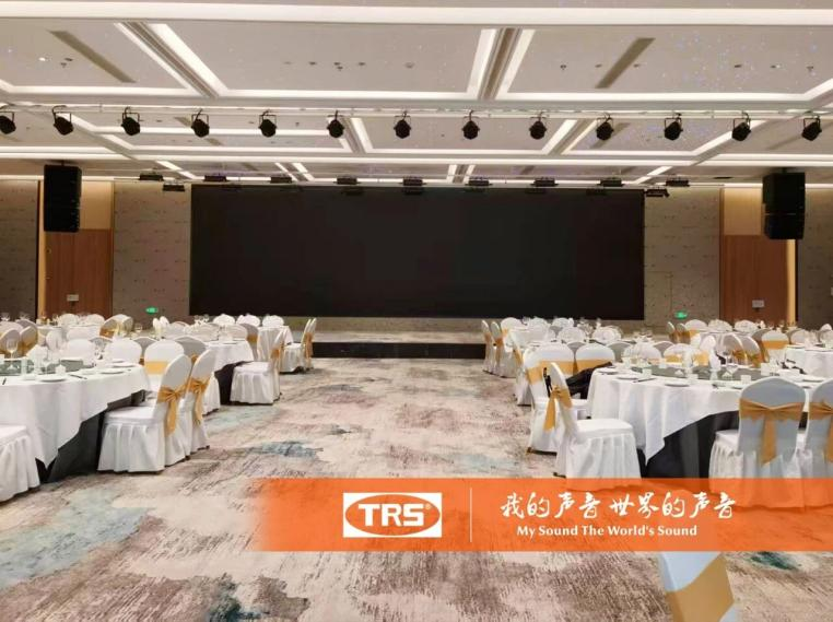 બીજા માળે આવેલ બેન્ક્વેટ હોલ હોટલોમાં લગ્ન જેવા મોટા પાયે કાર્યક્રમોનું આયોજન કરવા માટે મુખ્ય સ્થળ તરીકે સેવા આપે છે. એકંદર રંગ યોજના મુખ્યત્વે સફેદ અને આછા વાદળી રંગની છે, જે સોનાના ઉચ્ચારોથી શણગારેલી છે, અને ટોચ પર તારાઓની લાઇટિંગ દ્વારા પૂરક છે, જે એક ભવ્ય અને રોમેન્ટિક વાતાવરણ બનાવે છે. હોલ વિશાળ છે અને તેની ફ્લોર ઊંચાઈ ઊંચી છે. તેની માળખાકીય લાક્ષણિકતાઓ અને ઉપયોગની આવશ્યકતાઓના આધારે, સાઉન્ડ સિસ્ટમ મુખ્ય ધ્વનિ મજબૂતીકરણ સ્પીકર્સ તરીકે TX-20 ડ્યુઅલ 10-ઇંચ લાઇન એરે સ્પીકર્સનો ઉપયોગ કરે છે, જે C-15 પૂર્ણ શ્રેણીના સ્પીકર્સ દ્વારા પૂરક છે, અને DXP શ્રેણીના વ્યાવસાયિક એમ્પ્લીફાયર અને અન્ય પેરિફેરલ સાધનોથી સજ્જ છે. ચોક્કસ સ્ટેકીંગ અને વિવિધ સ્પીકર્સ વચ્ચે કવરેજ દ્વારા, તે ખાતરી કરે છે કે ધ્વનિની સંપૂર્ણ આવર્તન શ્રેણી વિવિધ પ્રવૃત્તિઓમાં સમાન અને સ્પષ્ટ રીતે રજૂ કરી શકાય છે, જે એકંદર શ્રાવ્ય અનુભવને વધારે છે.